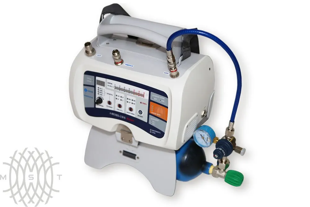 Транспортный аппарат ИВЛ, ВВЛ, СЛР и ингаляции Транспортный вентилятор нового поколения со встроенным компрессором и возможностью работы от кислородного концентратора низкого давления. Аппарат имеет возможность проводить респираторную поддержку с концентрацией кислорода 40% без использования баллонов. Встроенный компрессор позволяет проводить искусственную вентиляцию легких без баллона Встроенная система голосовых подсказок и предупреждений, система звуковых и визуальных тревог Автоматическая адаптация параметров вентиляции, регулируемая по приблизительному весу пострадавшего Применяется при оснащении автомобилей скорой помощи класса B и C по приказу АСМП 388