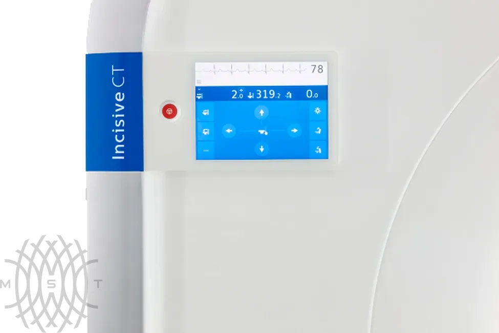 - Сенсорные контроллеры на гентри аппарата, которые повышают удобство использования системы, позволяют сократить время исследования и являются встроенным кардиомонитором
