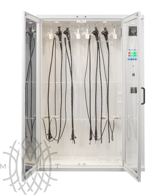 • Угол открытия дверей: до 180°, что облегчает загрузку и выгрузку эндоскопов Возможность механической блокировки дверей (замок)